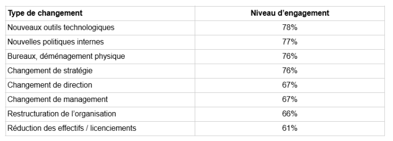 Les changements liés à l’investissement et à la construction de l’avenir sont corrélés à un engagement élevé : nouvelles technologies comme l’IA, politiques de travail nouvelles ou mises à jour et évolutions stratégiques. À l’inverse, les changements perturbateurs tels que les licenciements, les réorganisations et les changements de direction produisent l’effet inverse.