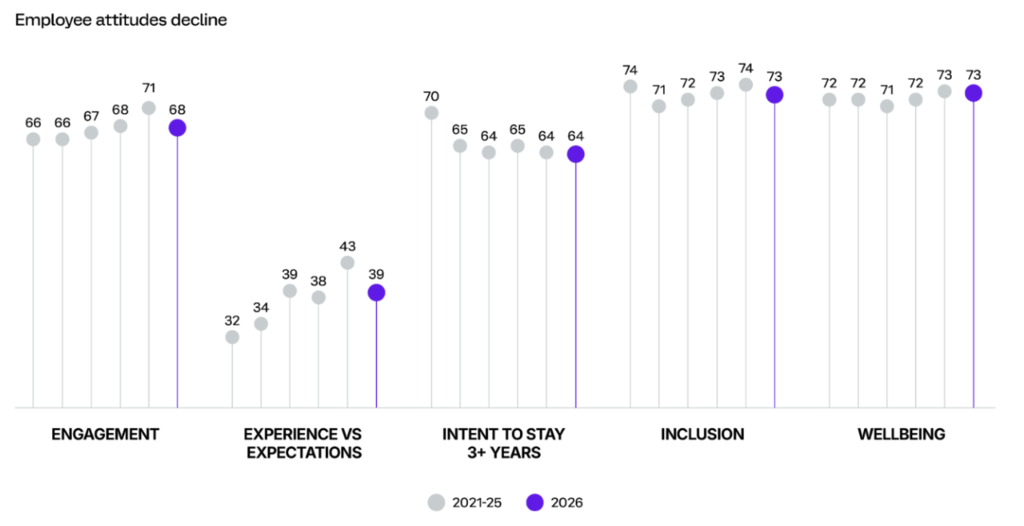 L’engagement des collaborateurs et la capacité de l’entreprise à dépasser leurs attentes ont légèrement baissé par rapport à l’an dernier, tandis que l’intention de rester, l’inclusion et le bien-être sont restés stables.