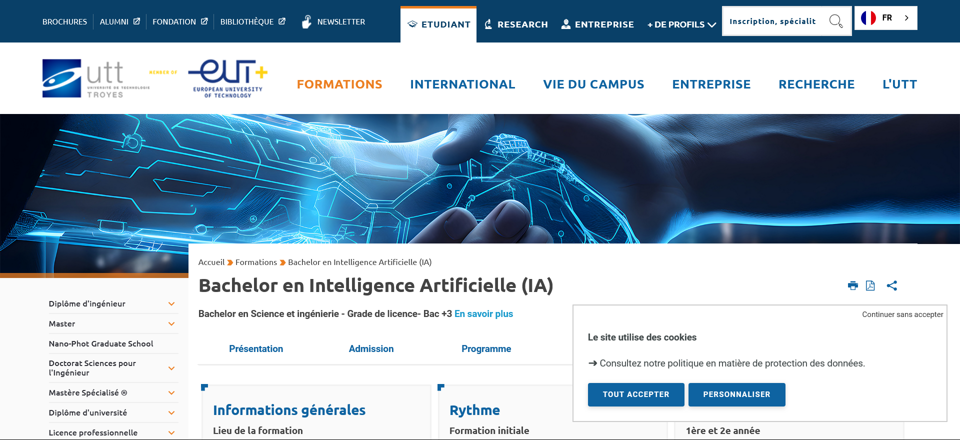 L’UTT a lancé son Bachelor en Intelligence Artificielle en septembre 2025 pour répondre à la forte demande de compétences dans ce domaine. Cette formation professionnalisante permet aux étudiantes et étudiants d’intervenir sur l’ensemble du cycle de vie d’un projet IA : collecte et analyse des données, proposition, test, mise en production des solutions, tout en intégrant les enjeux éthiques, juridiques et environnementaux.
